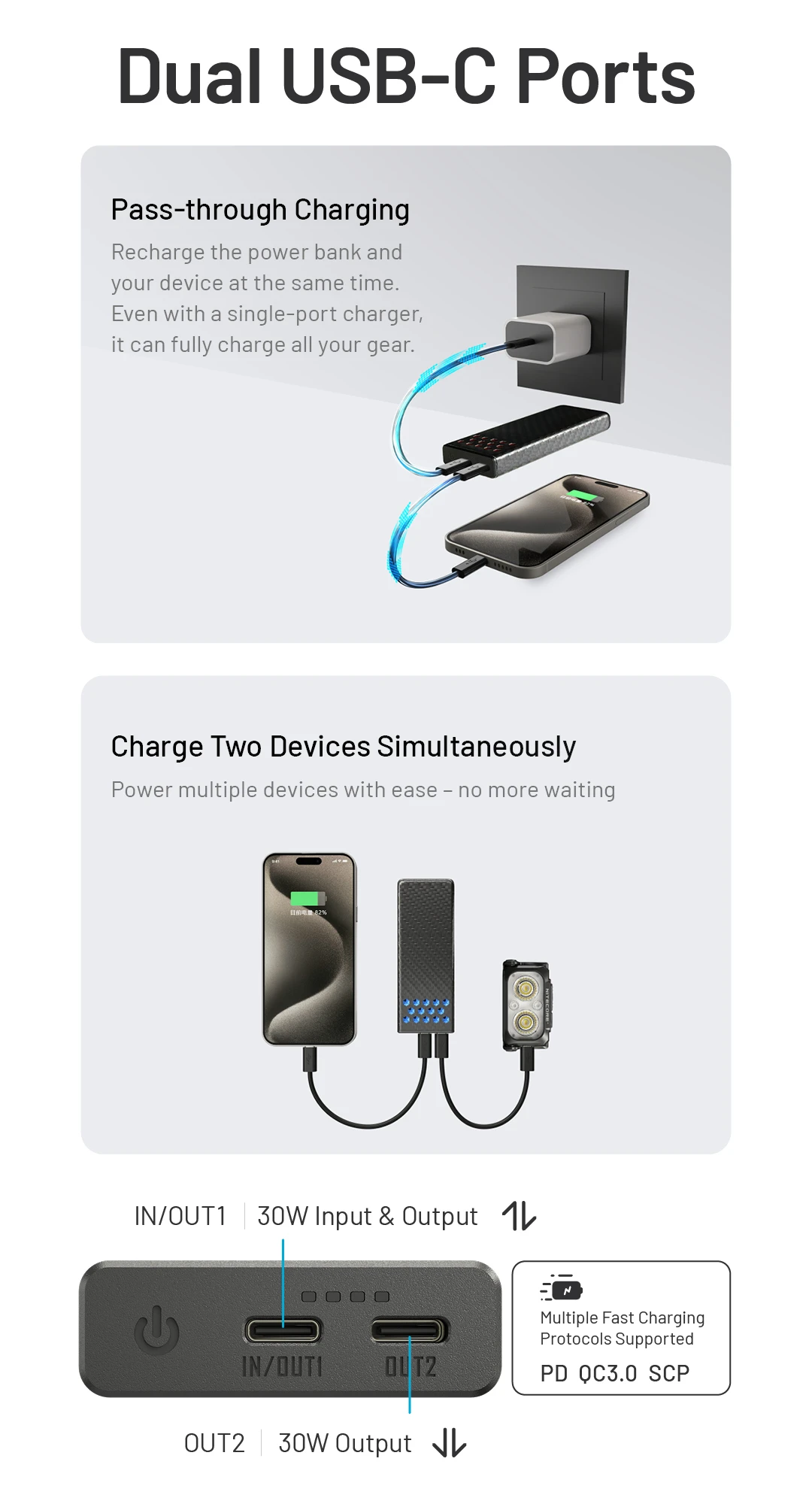 Output: USB-C (OUT1) / (OUT2) : 5V⎓3A / 9V⎓3A / 12V⎓2.5A / 15V⎓2A / 10V⎓2.25A (30W MAX)